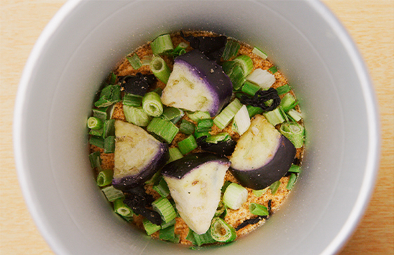 | 原材料 | 米みそ(国内製造)、揚げなす、砂糖、わかめ、豆みそ、ねぎ、食塩、かつおぶし粉末、そうだかつおぶし粉末、酵母パウダー、デキストリン/調味料(アミノ酸等)、<一部に大豆を含む> |