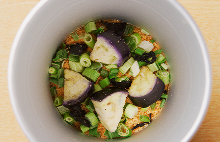 | 原材料 | 米みそ(国内製造)、揚げなす、砂糖、わかめ、豆みそ、ねぎ、食塩、かつおぶし粉末、そうだかつおぶし粉末、酵母パウダー、デキストリン/調味料(アミノ酸等)、<一部に大豆を含む> |
